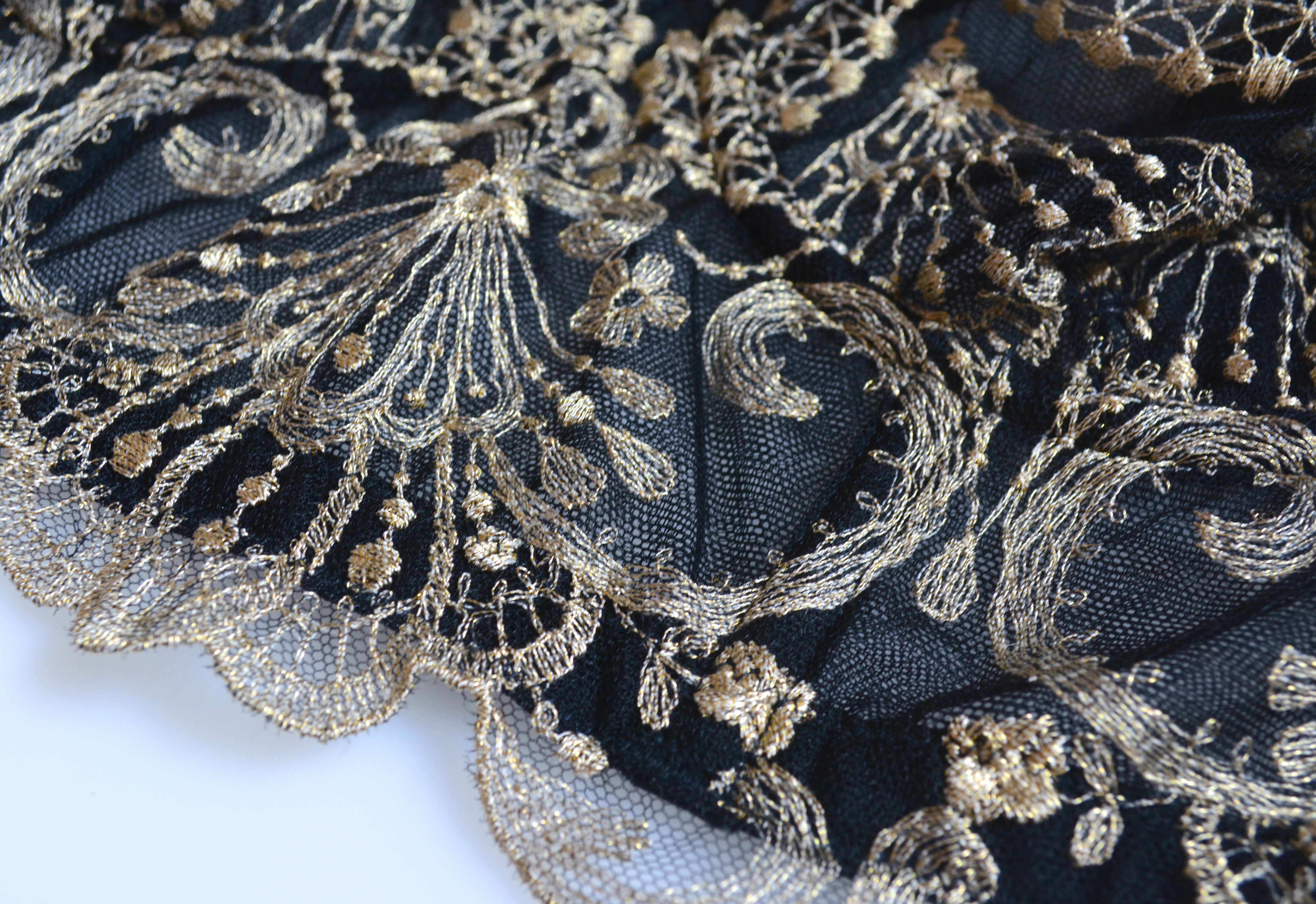 Tailored from luminous gold-threaded French embroidery and sheer black tulle, its superior construction provides uplift and a youthful, round silhouette without digging.