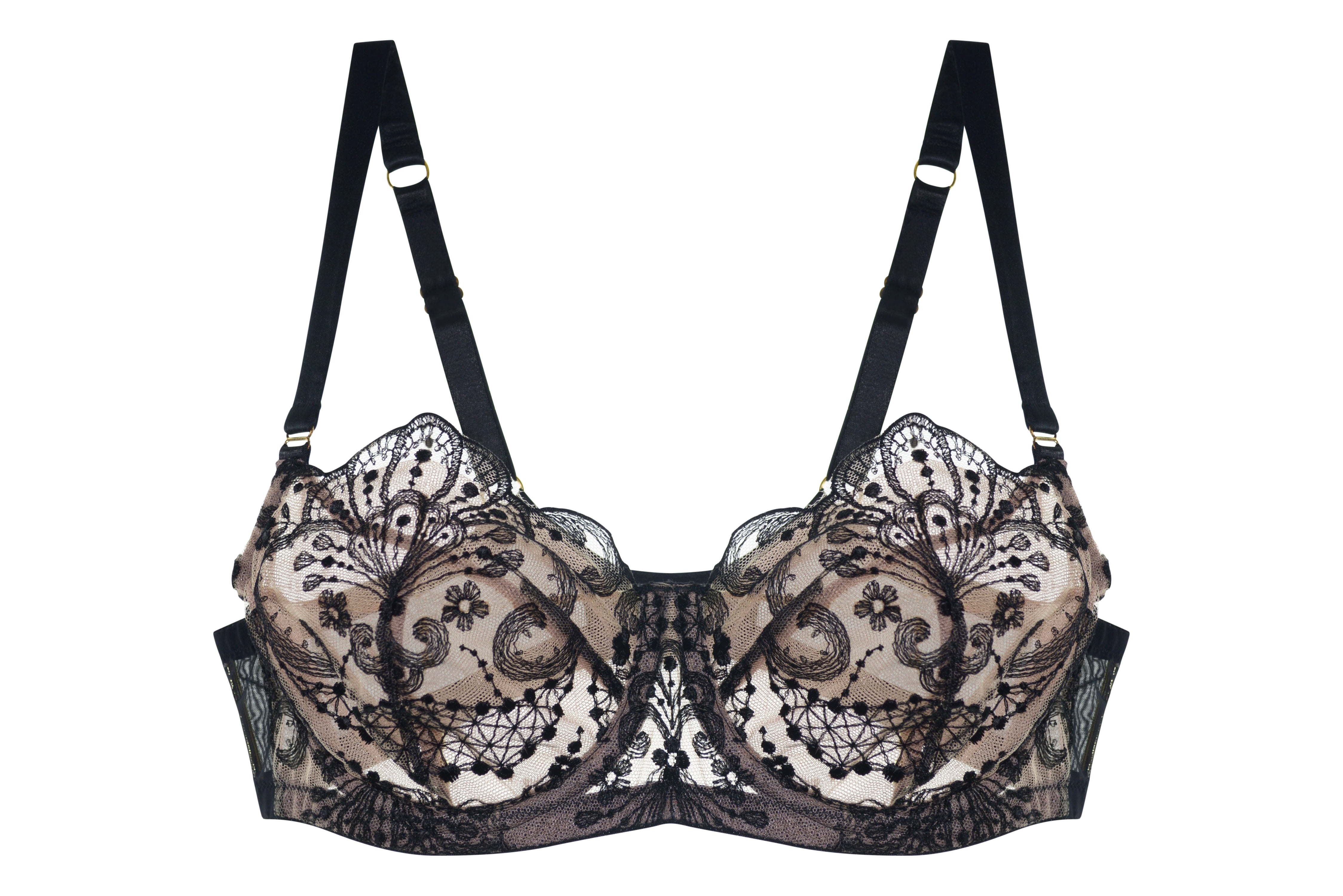 Steal the spotlight in this deep balconette bra adorned with unique and eye-catching French embroidery. This unforgettable look is enhanced with silk encased straps, while hidden construction provides uplift and all-day comfort for a top-curvy figure. Double layer of soft, breathable tulle lining ensures modesty, allowing you to flaunt it in a sultry outfit or keep it a secret beneath.